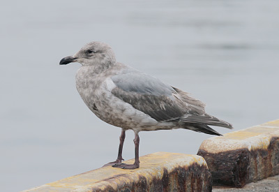 | ワシカモメ第2回冬羽は、背にグレーになり、腹は白っぽくなり、胸にはもやもやした濃いめの斑が目立ちます。嘴にはピンク色が混じるようになります。 | |||||||||||||||||||||||||||||||||