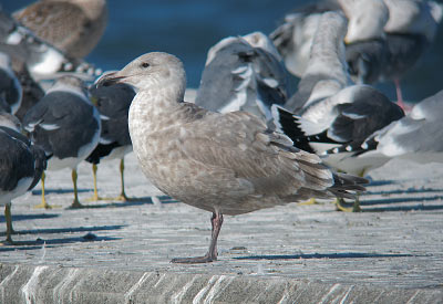 | モンゴルカモメ? 第2回冬羽 この個体は、背のグレーがやや薄く、体色が白っぽく尾羽の黒帯が細いのが目立ちました。 | |||||||||||||||||||||||||||||||||||||