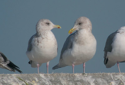 やや大きめの個体で、小型のセグロカモメより大きく見える事があります。 下の写真の左側は小型のセグロカモメで、胸の茶班の現れ方が異なり、右のカナダカモメはソフトでもやもやした感じです。 |