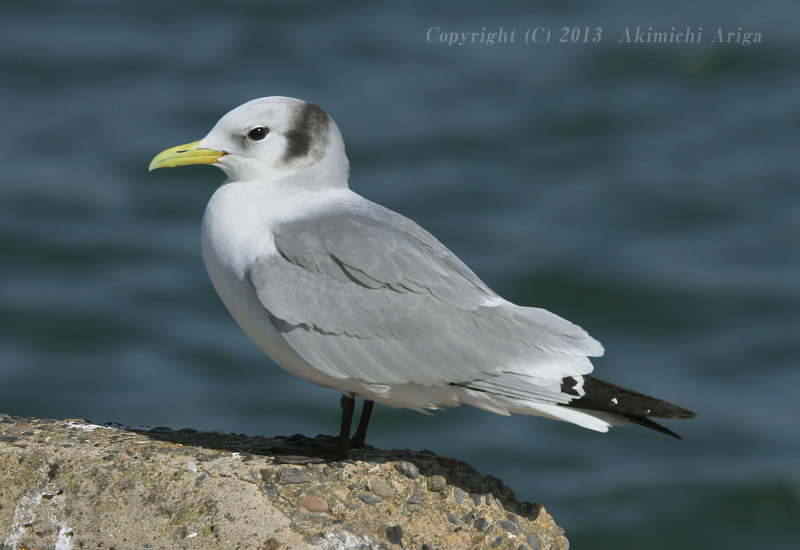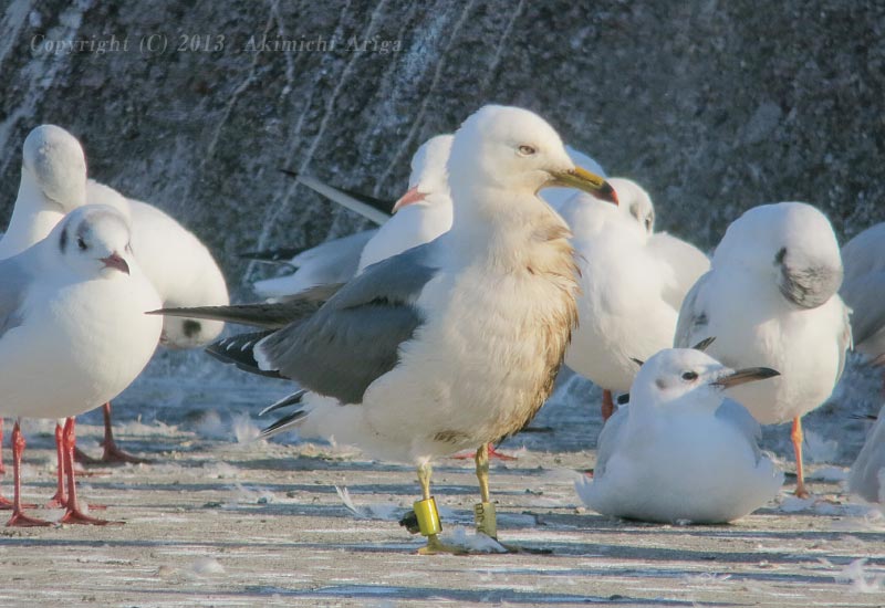 | 油漠標識ウミネコ 成鳥夏羽 (標識調査より第13回) この個体、頭部から腹部にかけて油で汚染されています。他にもウミネコの油漠個体を複数確認しました。 |