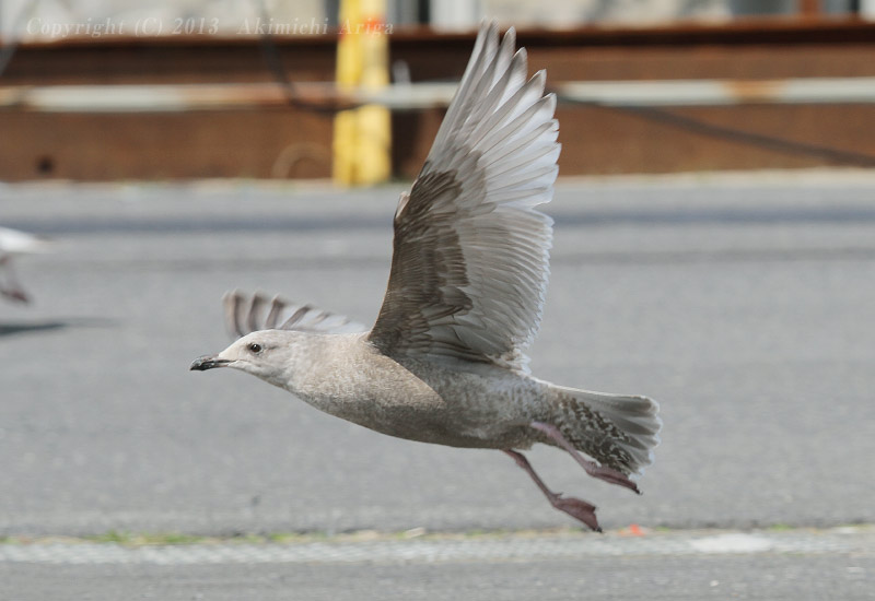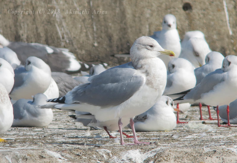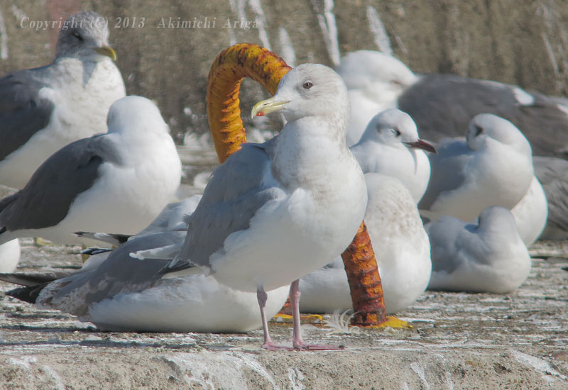 | ホイグリンカモメ?? 第3回冬羽 この個体、、背の濃いグレーにかわいらしい顔つきで目立ちました。この顔はオオセグロではないので、タイミルかなとも考えながら観察していると、嘴と足に黄色味があります。ホイグリンと断定するにはまだ経験不足ですが、グレーの濃さや黄色味の足と嘴からホイグリンカモメかもしれないと思いますが、頭部があまり白くなく、足も短めな点はタイミル的にも感じます。 | |||||||||||||||||||||||||||||||||||||||||||