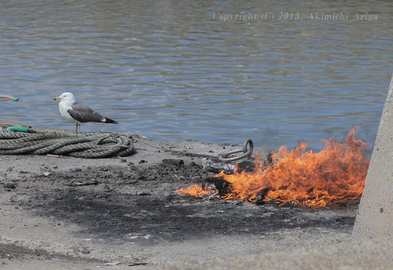 ゴミの焼却で炎が燃えさかっていますが、直ぐ横でウミネコがたたずんでいます。この距離だと熱を感じると思うのですが、炎を怖がらないのだろうか。 |