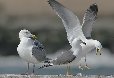 | ワシカモメ 右はウミネコ 第4回夏羽 銚子港 ウミネコが声を出しながら降りてきました。 |