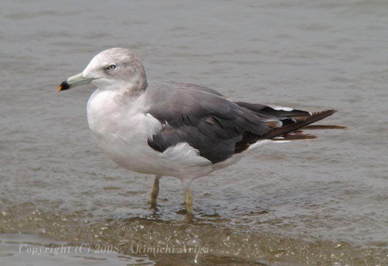 | ウミネコ 第3回冬羽へ移行中 第2回夏羽から第3回冬羽への移行中の個体は、初列に退色摩耗した旧羽と白斑のある新羽が目立ちます。 |